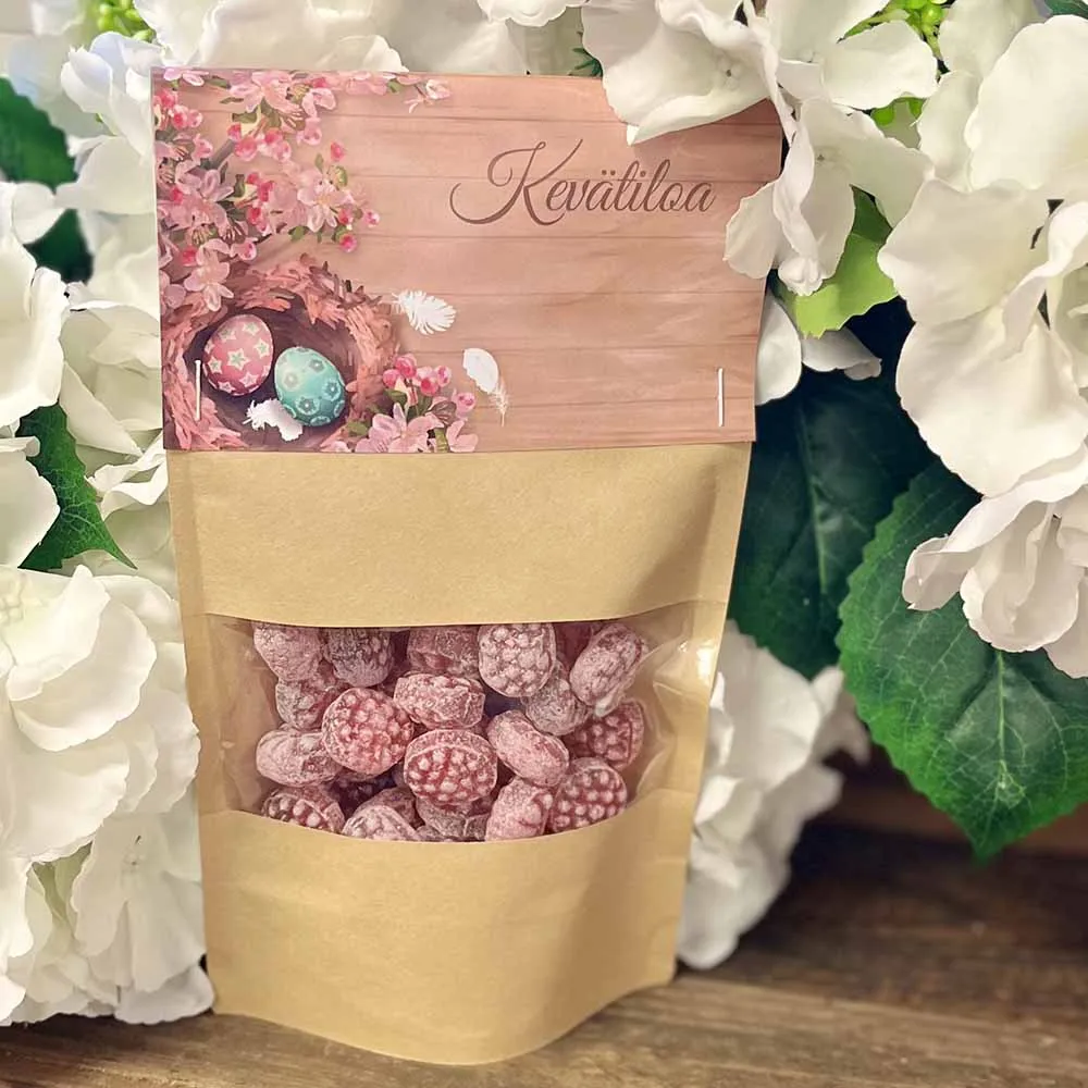 Perinteisenmallisia vadelmakaramelleja kauniissa pussissa jossa teksti Kevätiloa.