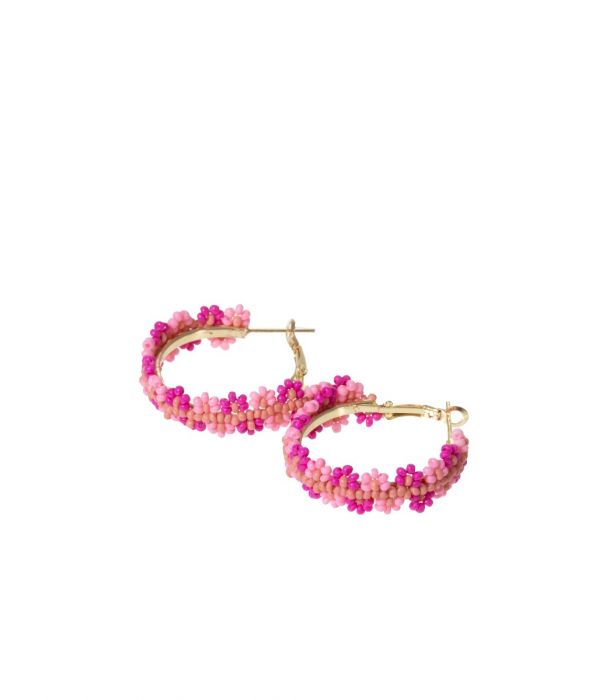 Roikkuvat rengasmalliset korvakorut, kultainen rengas, jota koristaa muovisista helmistä kootut kukat. Yhden korun Ø2,5cm.