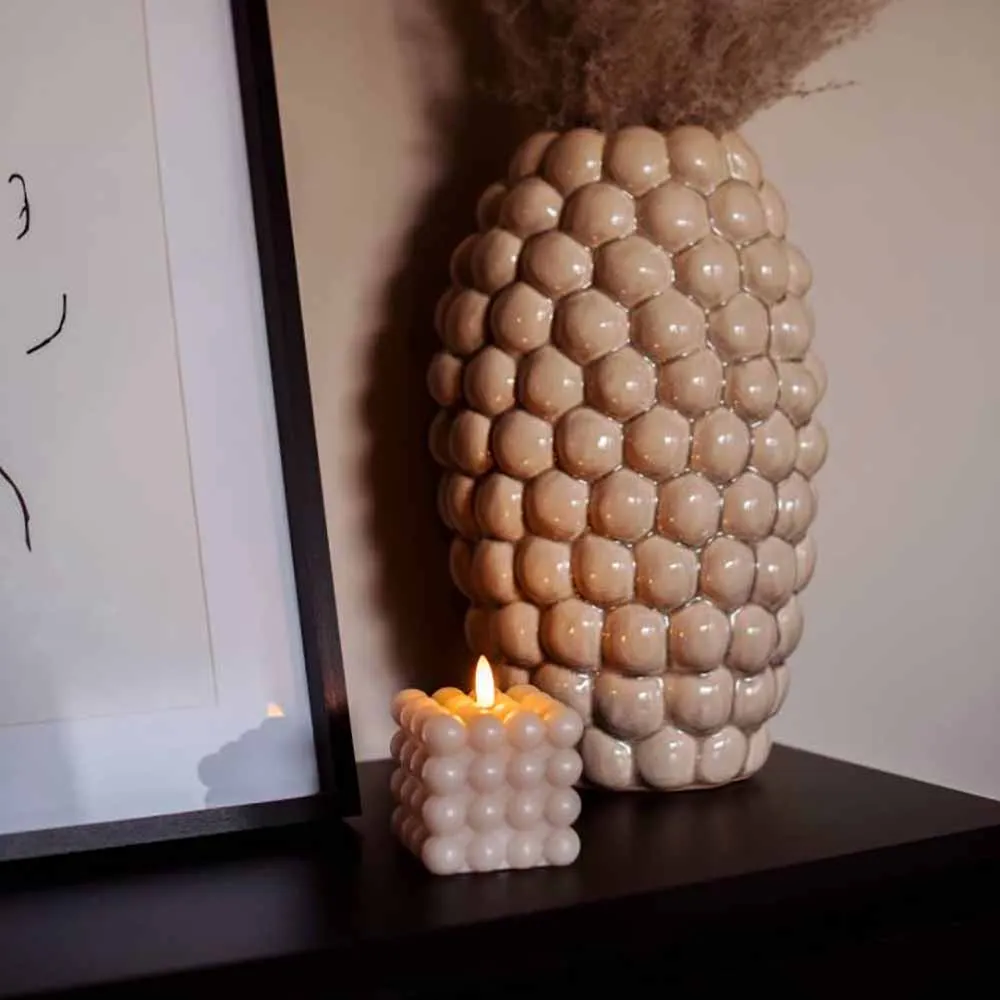 Kaunis kuutionmallinen LED-kuplakynttilä beigen sävyssä.