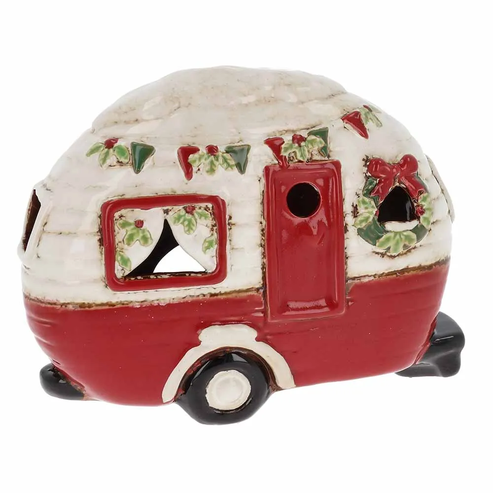 Ihastuttava keraaminen lyhty tuikulle. Suosittu malli, Caravan-matkailuvaunu, nyt jouluasussa!