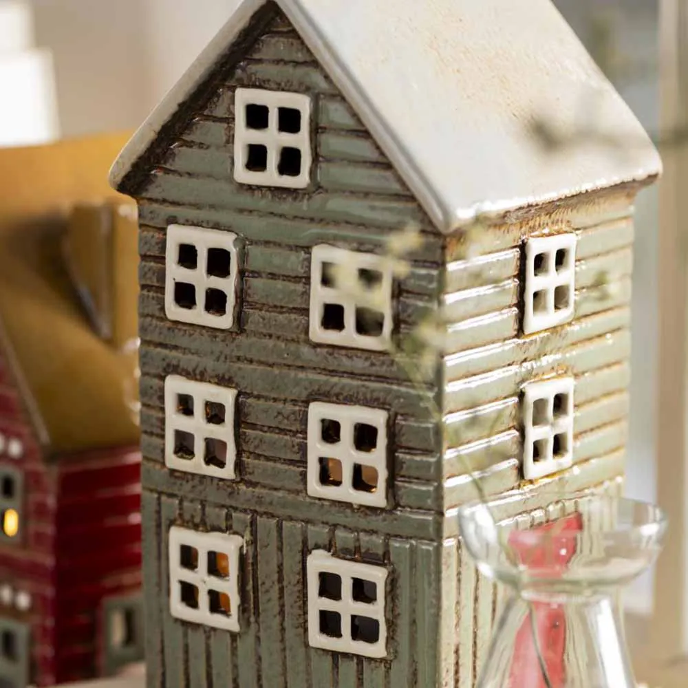 Kaunis keraaminen talolyhty tuikulle. Thorshavn-sarjan talolyhty vihreän sävyssä vaaleanharmaalla katolla. Sivussa kiva punainen ovi.