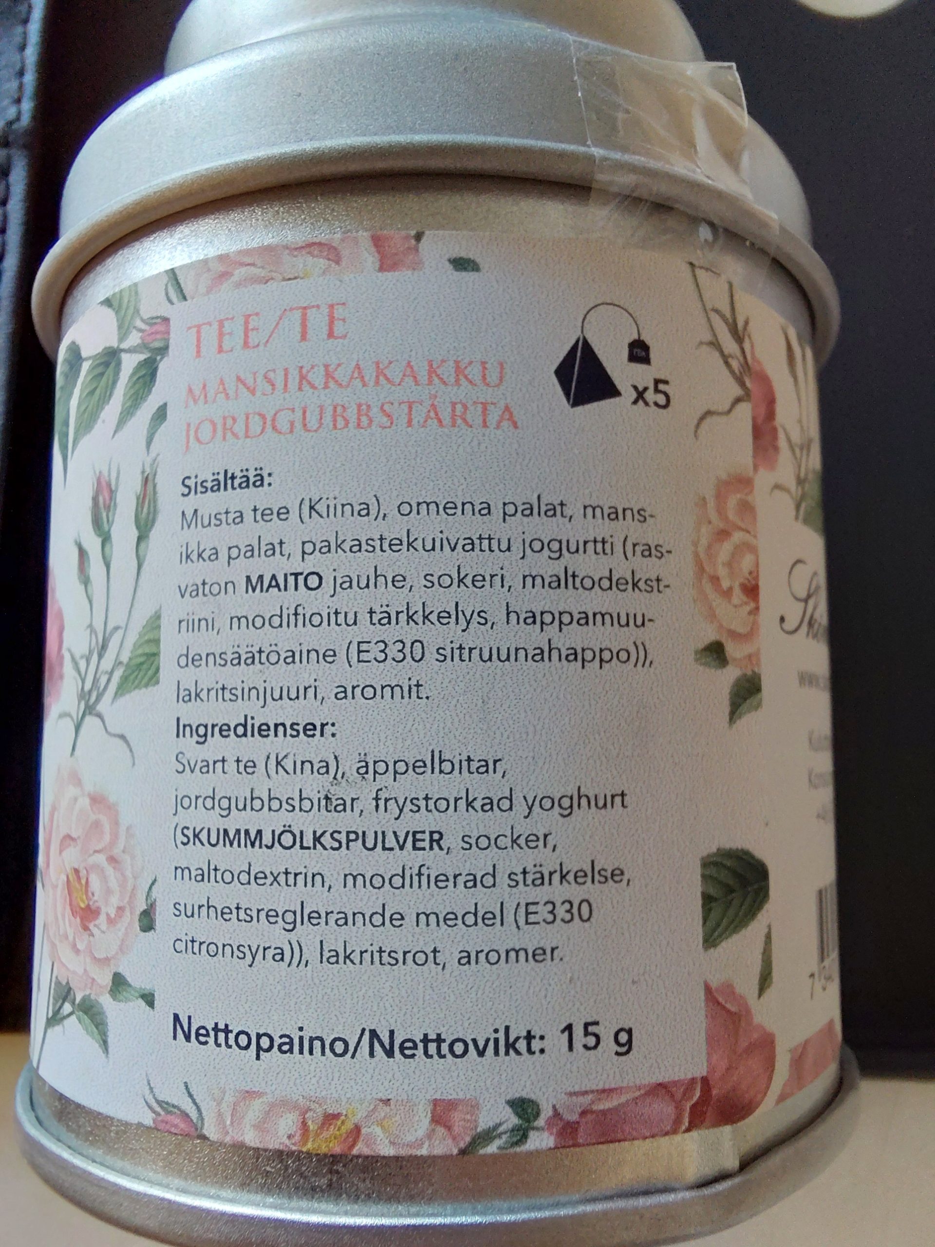 | TUOTESELOSTE | Musta tee(Kiina),omenapalat,mansikkapalat,,pakastekuivattu jogurtti(rasvaton maitojauhe,sokeri,maltodekstriini,modifioitu tärkkelys,happamuudensäätöaine(E330 sitruunahappo)),lakritsinjuuri,aromit |