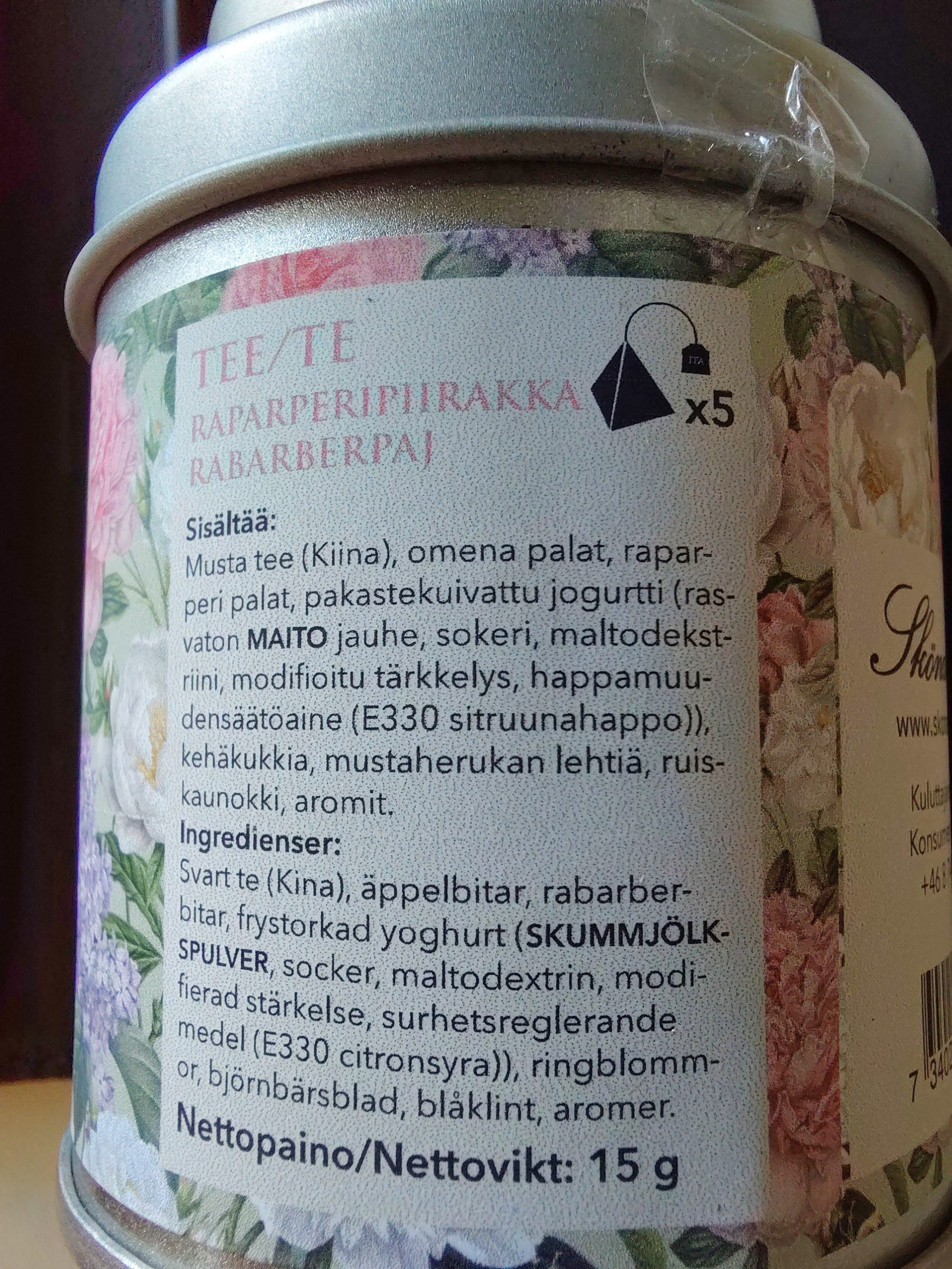 | TUOTESELOSTE | Musta tee(Kiina),omenapalat,raparperipalat,,pakastekuivattu jogurtti(rasvaton maitojauhe,sokeri,maltodekstriini,modifioitu tärkkelys,happamuudensäätöaine(E330 sitruunahappo)),kehäkukkia,mustaherukan lehtiä,ruiskaunokki,aromit |