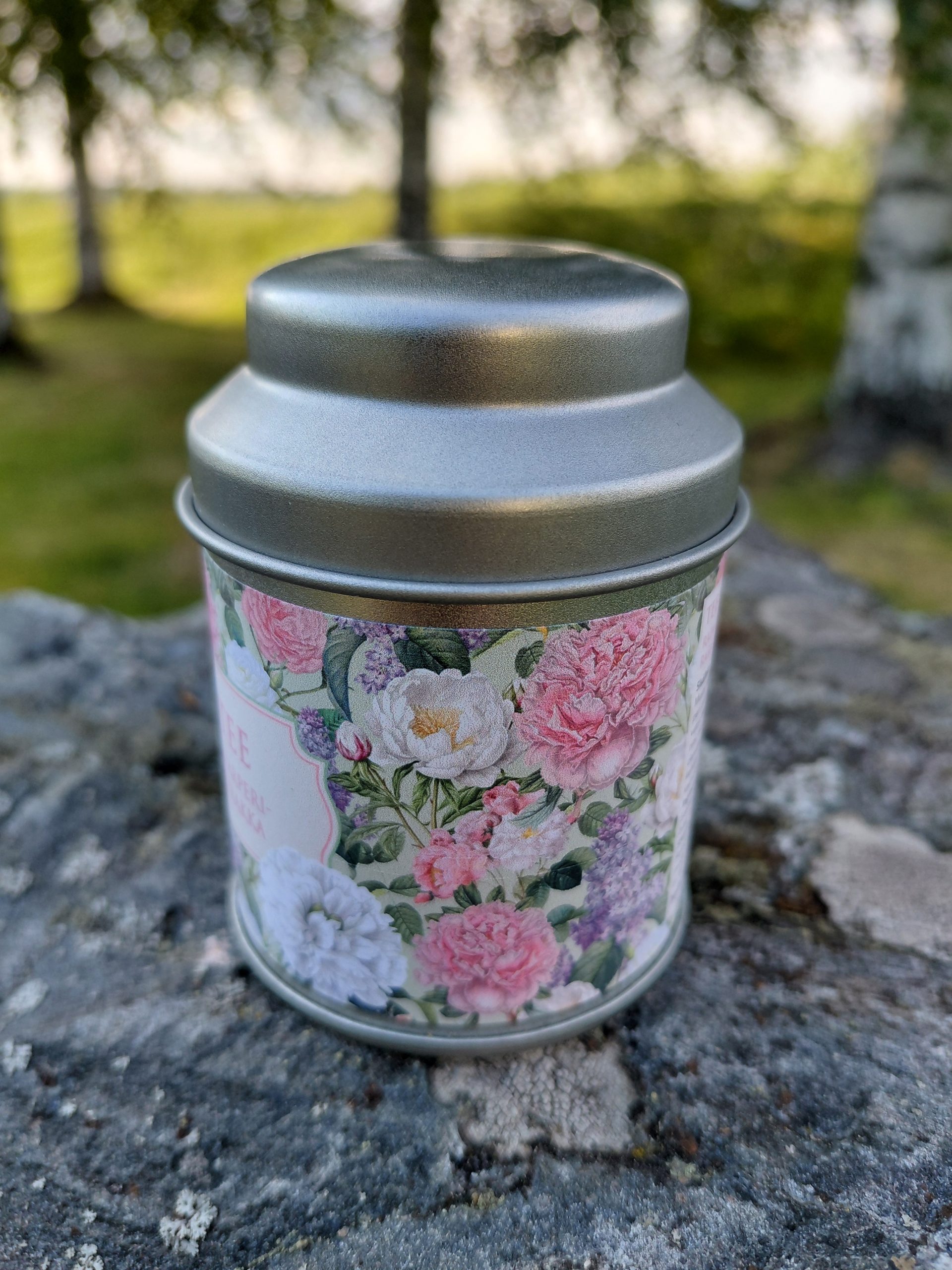 | VÄRI | metallikansi,purkissa kukkien kuvia. |