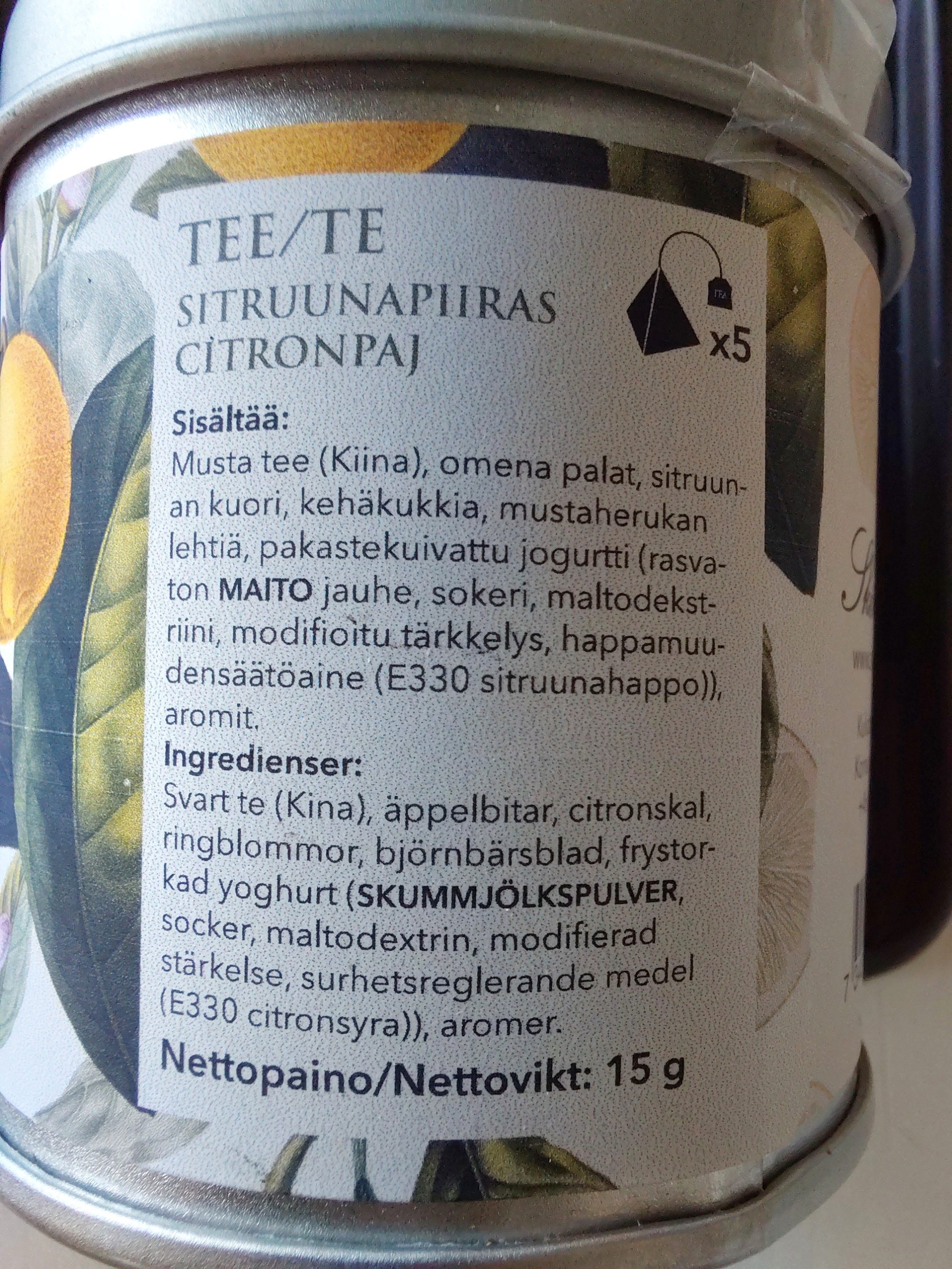 | TUOTESELOSTE | Musta tee(Kiina)omena palat,sitruunan kuori,kehäkukkia,mustaherukan lehtiä,pakastekuivattu jogurtti(rasvaton maitojauhe,sokeri,maltodekstriini,modifioitu tärkkelys,happamuudensäätöaine(E330 sitruunahappo)),aromit |