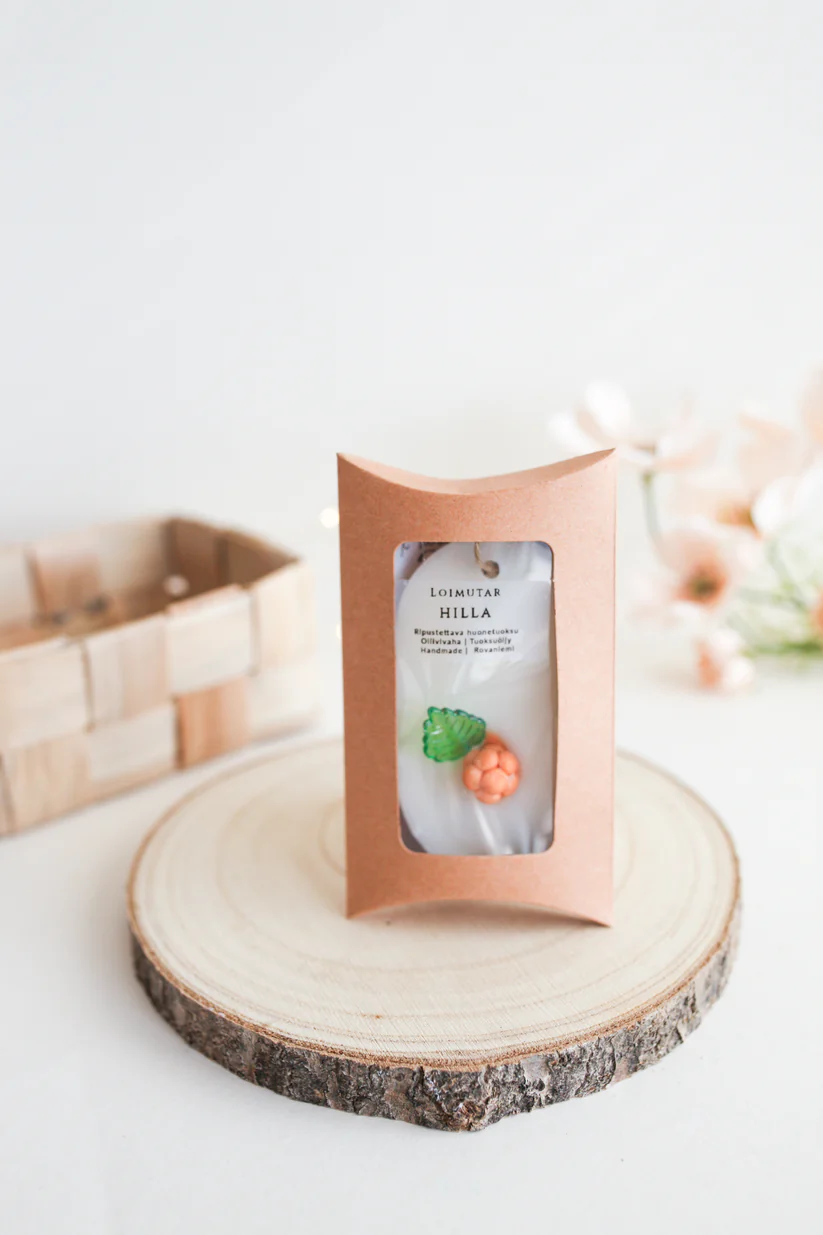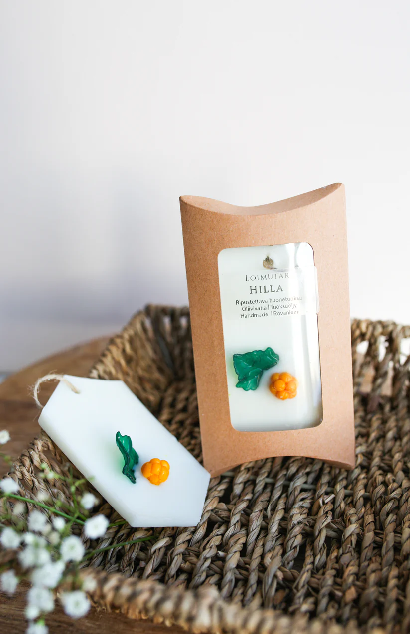 Tuoksulaatta vapauttaa tuoksua ympärilleen vähitellen ja tuoksu kestää jopa neljä kuukautta! Valettu oliivivahasta,sisältää hillan tuoksuista tuoksuöljyä.