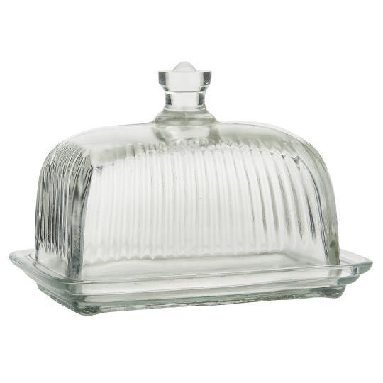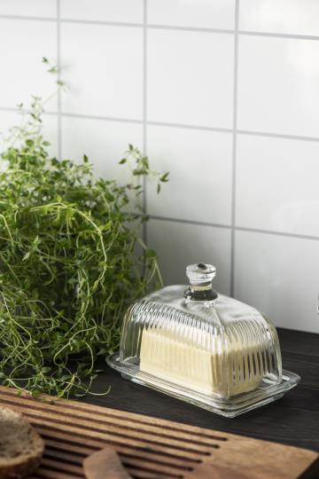 Kaunis lasinen voirasia.Voirasiassa kätevä nuppi.Rasian koko 10,5 x 12 x 16,8 cm.Tähän ihanaan lasiseen rasiaan voit laittaa voit,juustot…kauniisti esille kattaukseen.